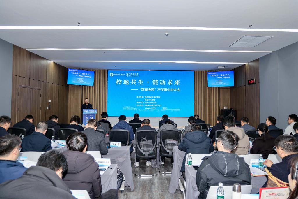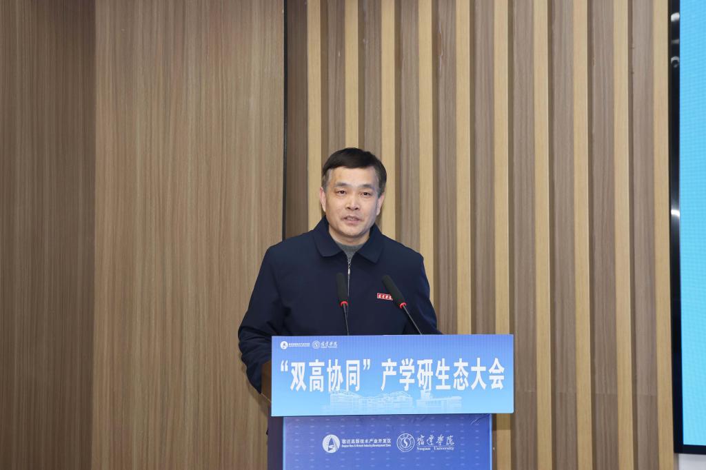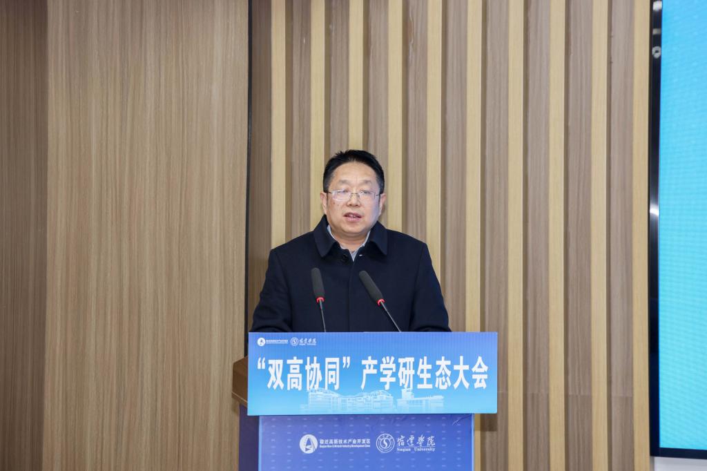为深化校地企合作,充分发挥好高校作为教育、科技、人才的交汇点作用,推动“双高协同”走深走实,1月9日下午,由宿迁高新区、宿迁学院、宿迁市科技局共同主办的“校地共生˙链动未来”“双高协同”产学研生态大会在宿迁大学科技园举行。校长郭照冰,宿迁高新区党工委副书记、管委会主任徐光良参加活动并致辞。副校长闫长春主持活动。