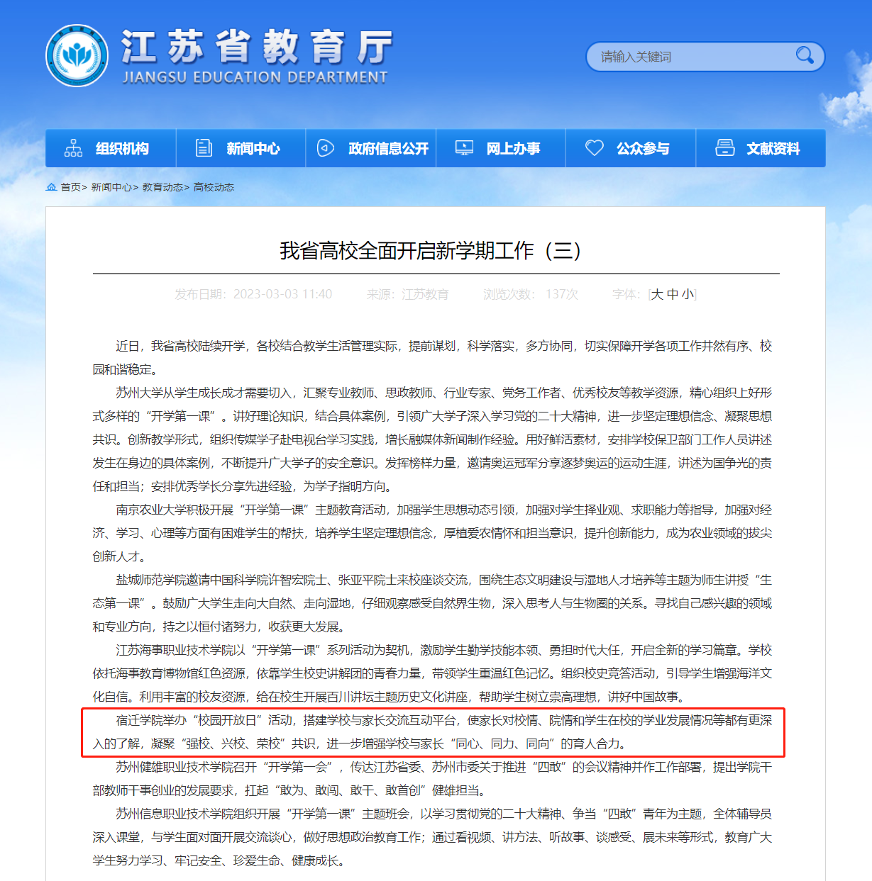 宿迁学院举办“校园开放日”活动,搭建学校与家长交流互动平台,使家长对校情、院情和学生在校的学业发展情况等都有更深入的了解,凝聚“强校、兴校、荣校”共识,进一步增强学校与家长“同心、同力、同向”的育人合力。