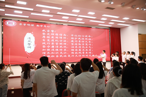 读清风誓词。“坚守廉洁底线,涵养清风正气;加强道德修养,锤炼意志品质……”现场的毕业生代表宣读清风誓词,将廉洁承诺内化于心。