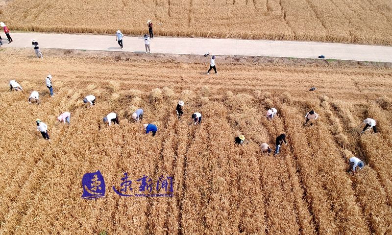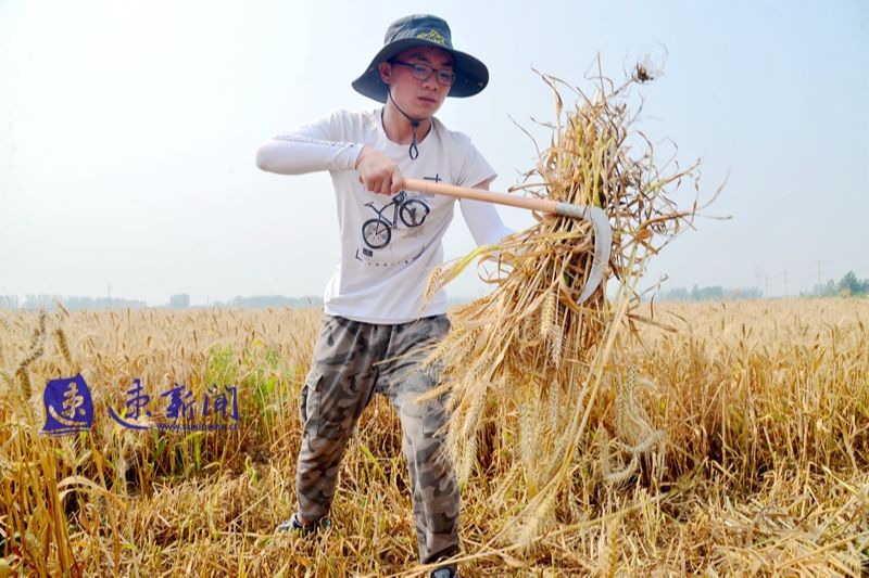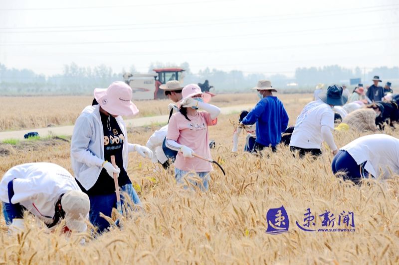 (速新闻记者王兵)握刀、下蹲、挥刀、割麦……夏日高照,麦浪涌涌,一群大学生挥舞镰刀收割小麦;田间地头处处涌动着热闹繁忙的景象,一张张青春洋溢的脸晒得通红……6月11日上午,宿迁学院60余名师生,来到泗阳县湖滨粮食家庭种植农场,组织开展以“体验农耕文化 厚植劳动情怀”为主题的劳动教育实践活动,让大学生们切身体验农耕活动,感受农耕文化。