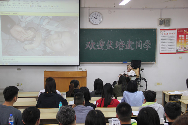 虽然身体处于残缺的世界里,伏培建却是自强不息,在摸索中学习,前进中坚持,逐渐实现了他给自己定下的一个个人生小目标。25岁那年,宿迁学院圆了他的“大学梦”,他第一次来到大学校园,成为宿迁学院“第51号同学”,愉快地度过了半天的大学生活。此后,他一直保持与宿迁学院领导、老师和同学的“热线联系”,也一直心存感恩之心。